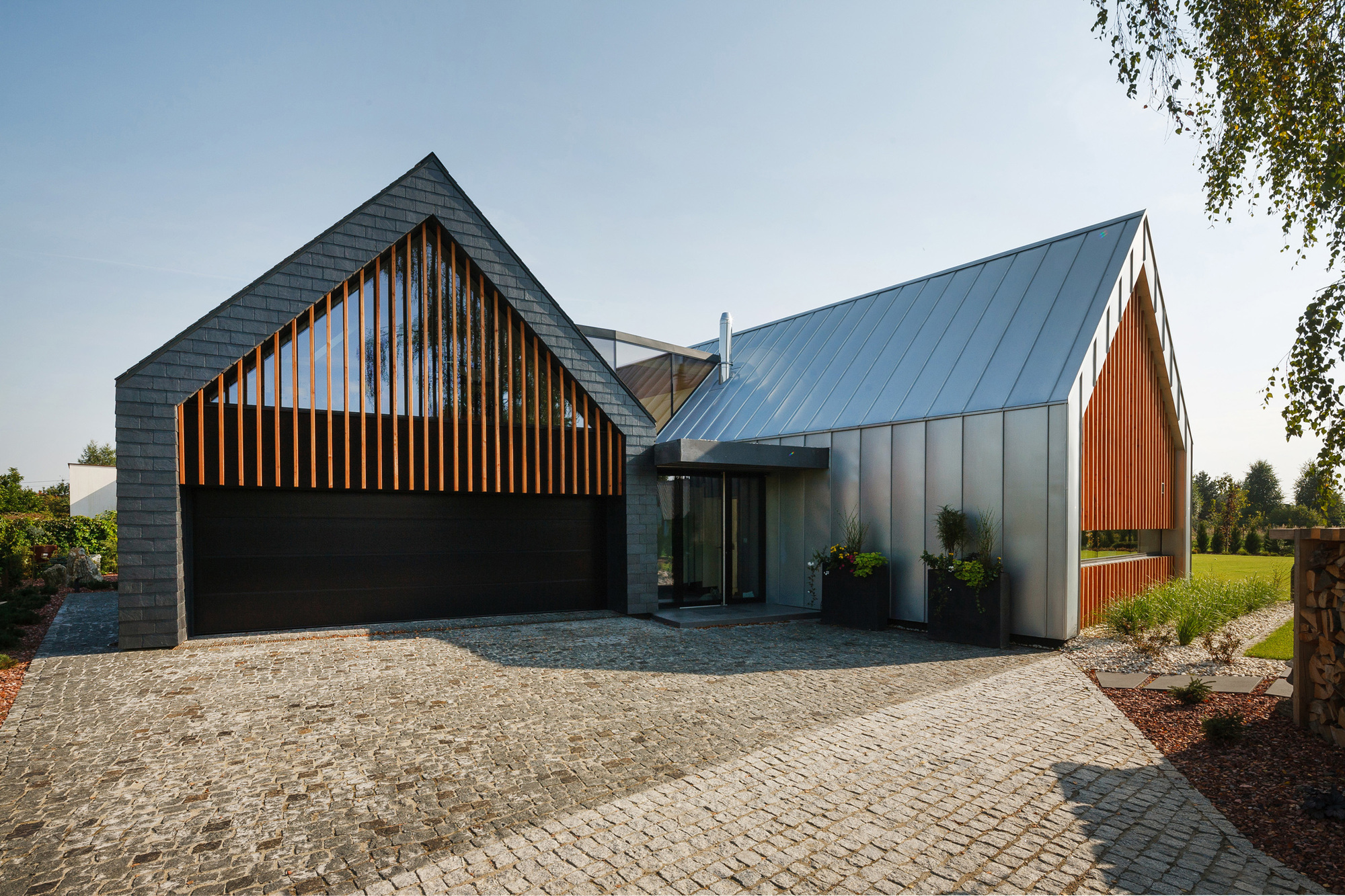 この建築はガルバとカラーベスト?が屋根から外壁へと連続して覆われた物件、納まりやディテールもすばらしく良いと思います。