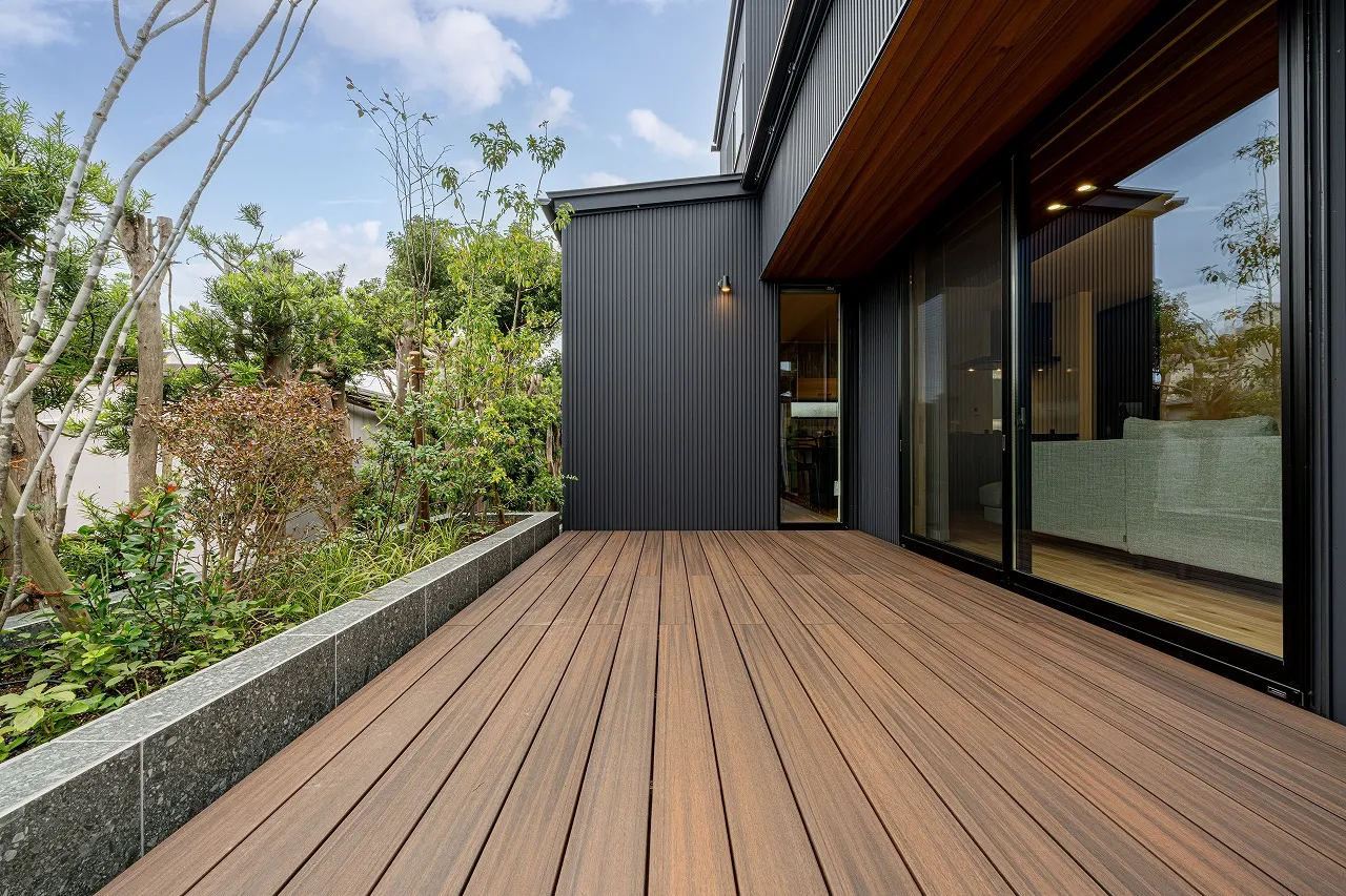 軒天にもレッドシダーを使用し、室内との一体感を高めた開放的なウッドデッキ。