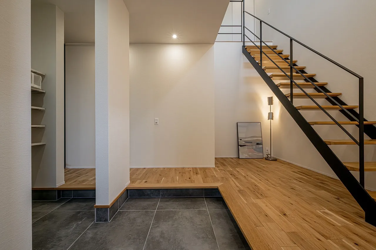 吹き抜けと鉄骨階段が出迎える、明るく開放的な玄関ホール。