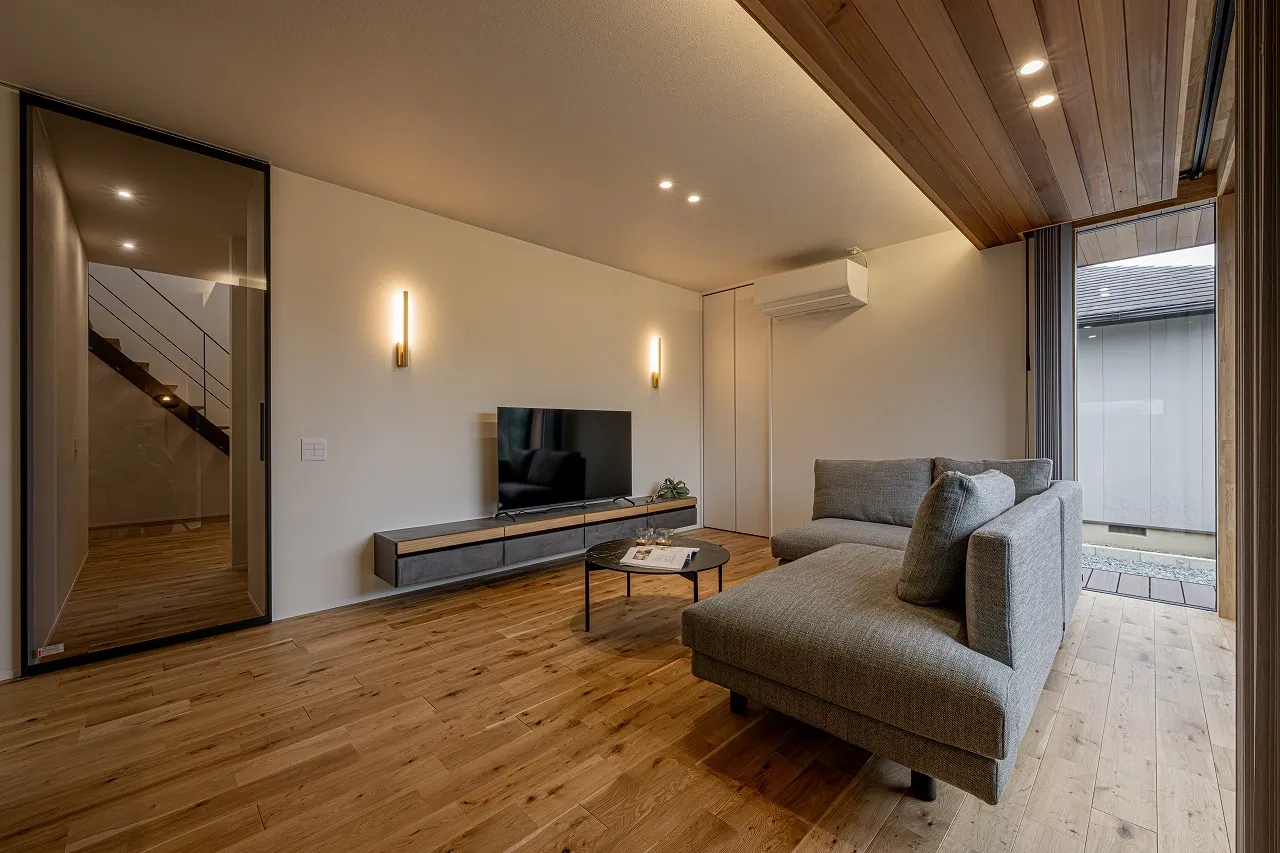 レッドシダー貼りの折り下げ天井と間接照明が、重厚感とカッコよさをプラスする21.8帖の広々LDK。