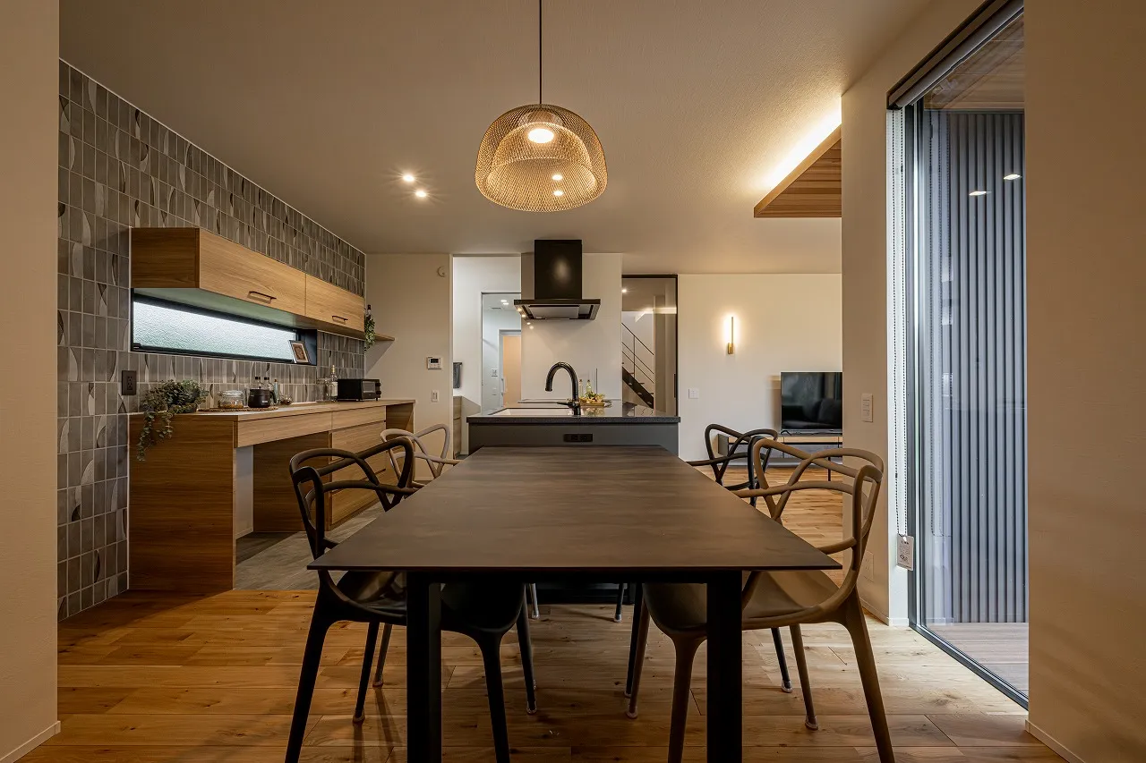 木の風合いが空間を引き立てる、回遊動線のキッチン&ダイニング。