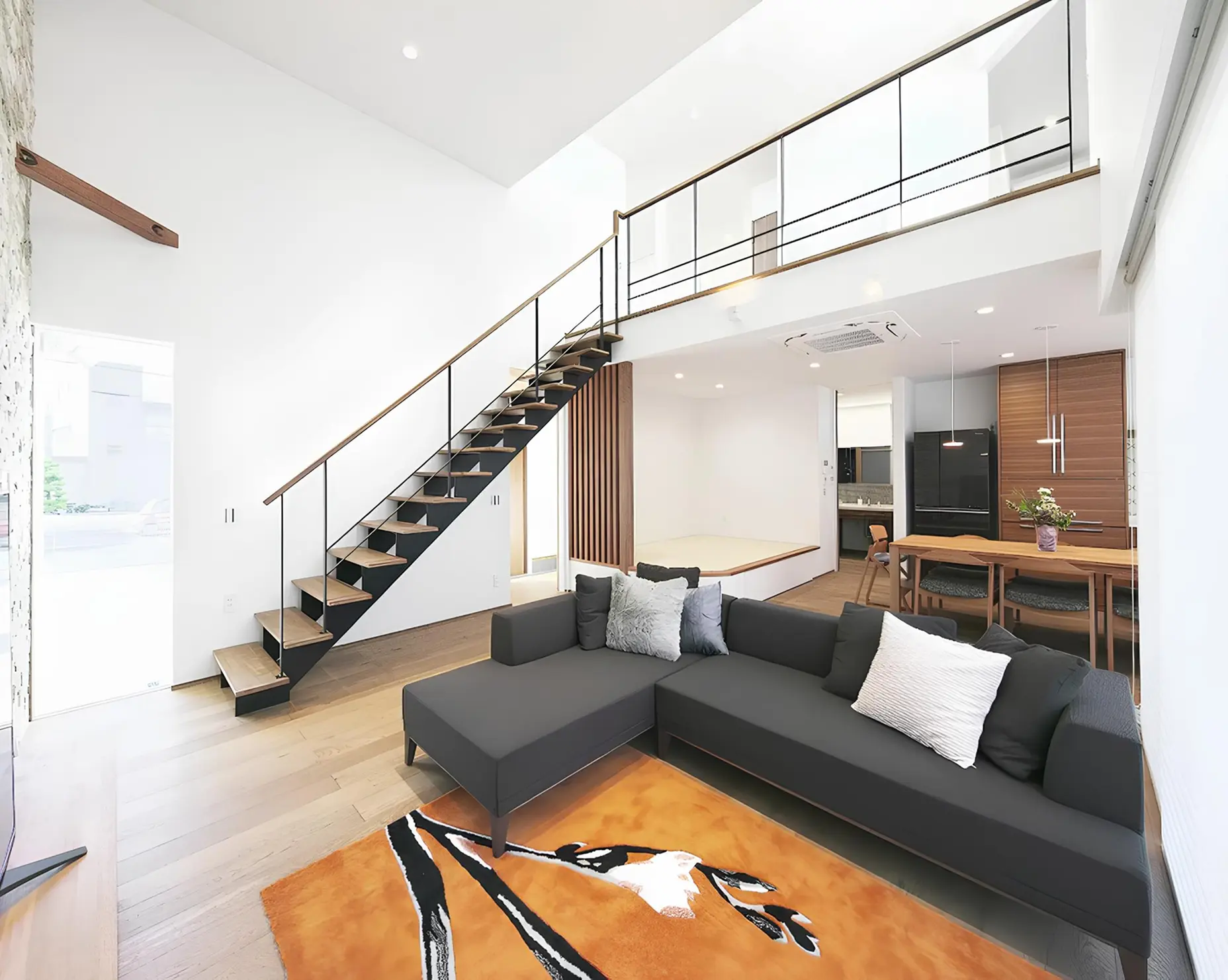 2階とつながる吹抜けが視界を縦に広げ、鉄骨階段の軽やかなデザインが空間に奥行きと開放感を生み出しています。