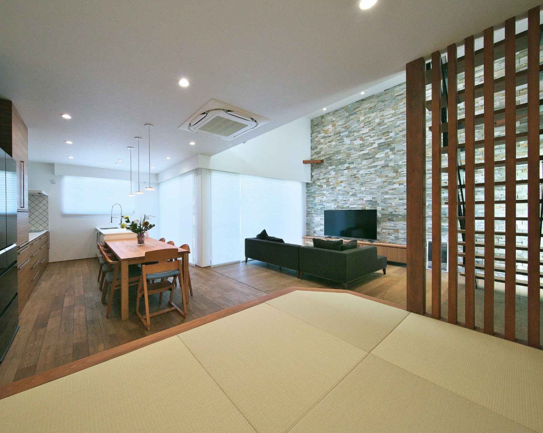 家族が寝転んだりくつろいだりできる柔らかな居場所を確保。洗練された中にも温もりのある住空間が広がります。