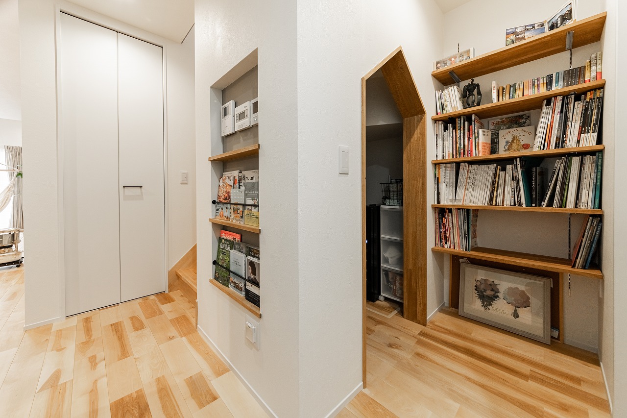 • たっぷりの書棚とマガジンラックの奥には、三角屋根の入り口が可愛らしいリビング収納室が顔を覗かせています。