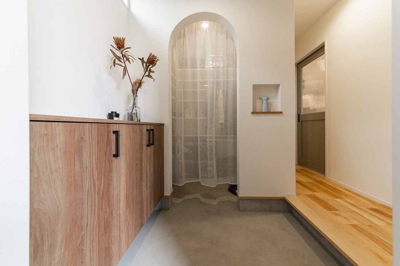• ウォークインクロークのある玄関。たっぷりの収納と、奥まった場所にもかかわらず明るい光の入る設計。