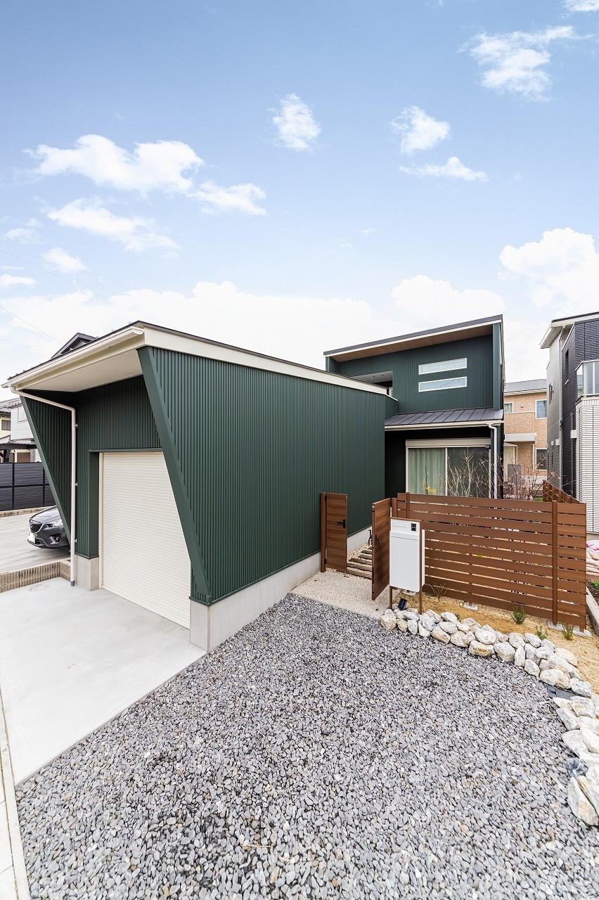 • ガレージが印象的な外観。中庭を通った先に、エントランスとガレージともつながる広々とした土間スペースがあります。