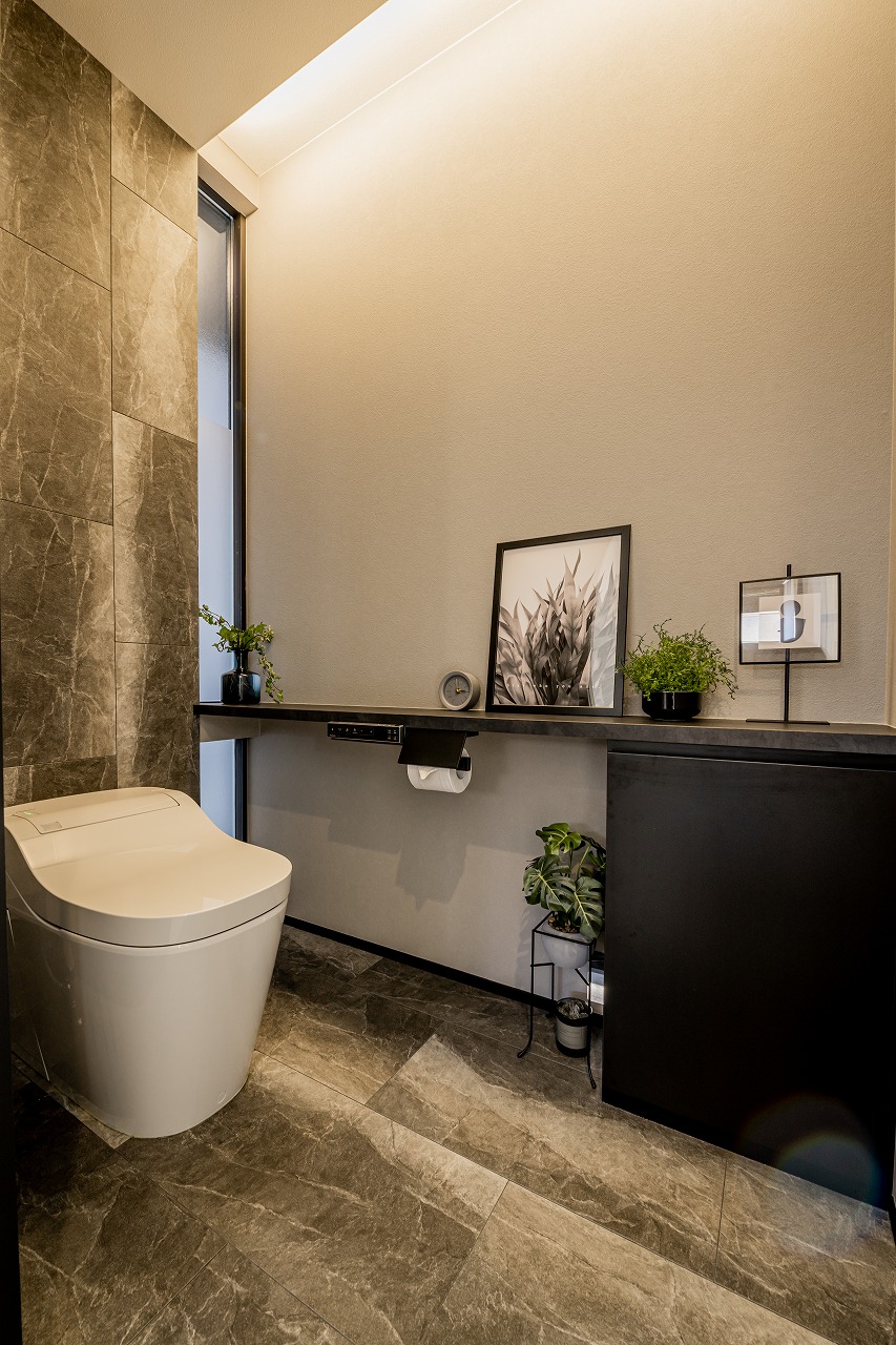 • ライン照明の光が美しいWC。床と壁のアクセントを合わせて高級感も。