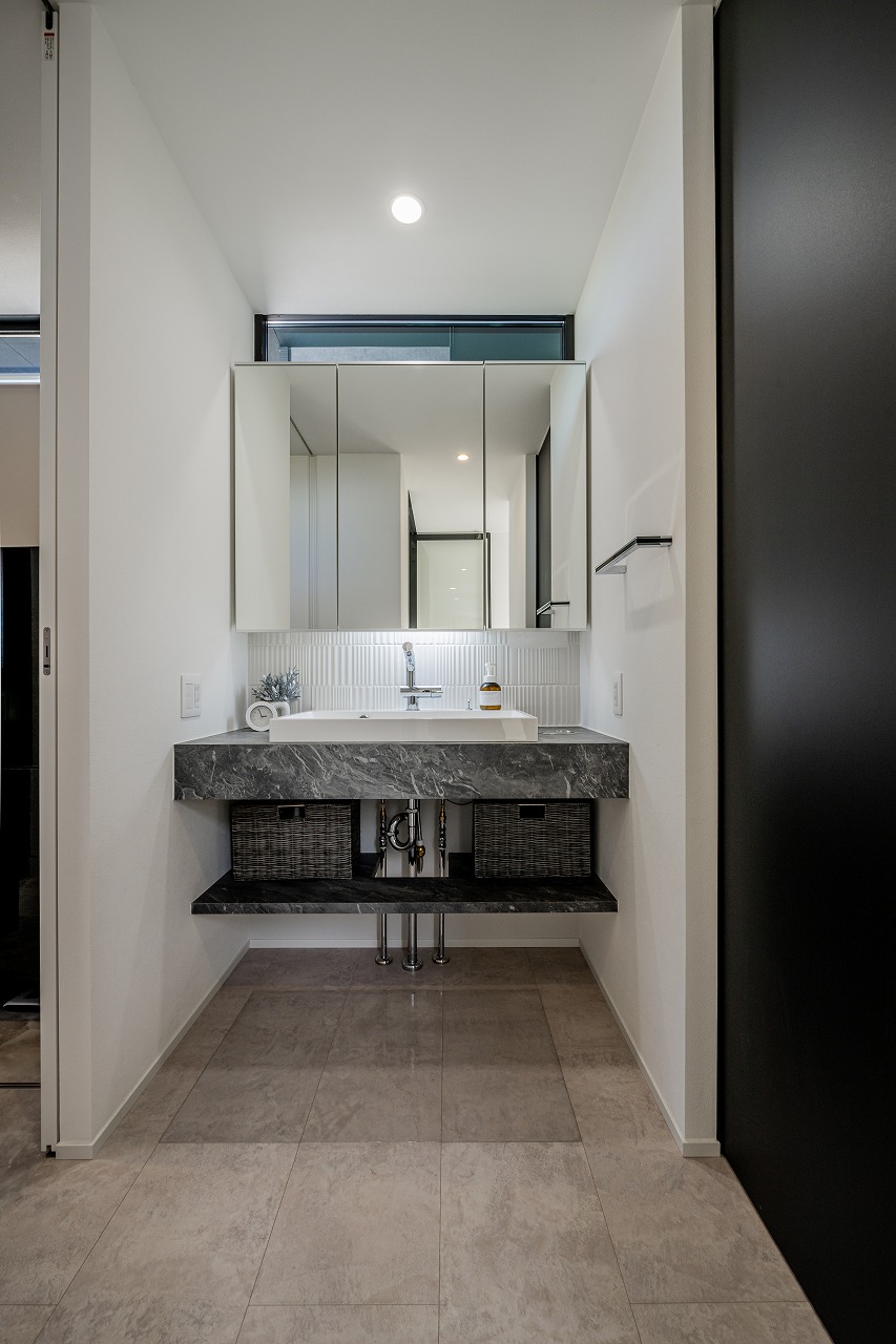 • 3面鏡で使いやすいオリジナルの造作洗面台。脱衣室と分かれているので、ご家族が入浴中でも使いやすい。