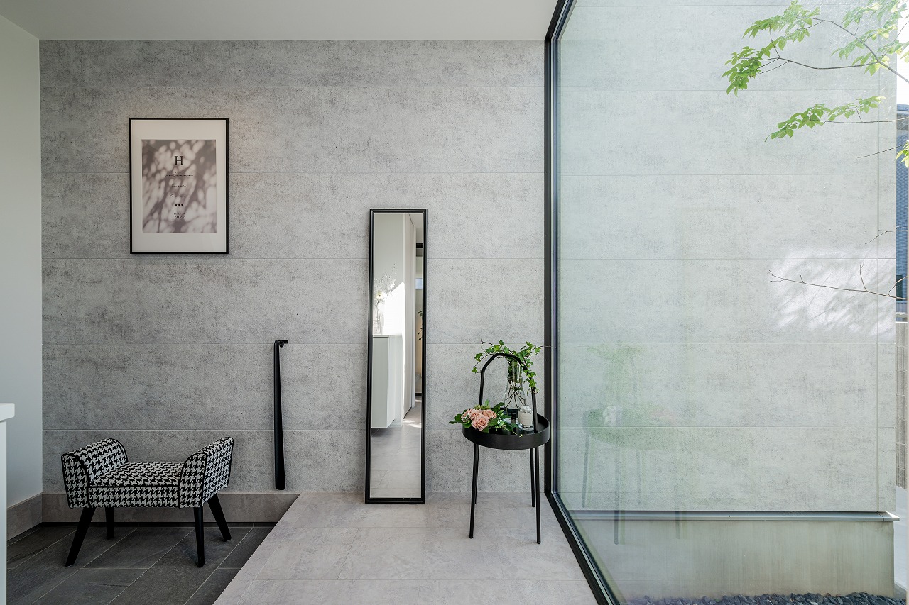 • 玄関入ると正面は中庭を見渡せる大きな1枚ガラス。美術館を感じさせるような美しい空間。