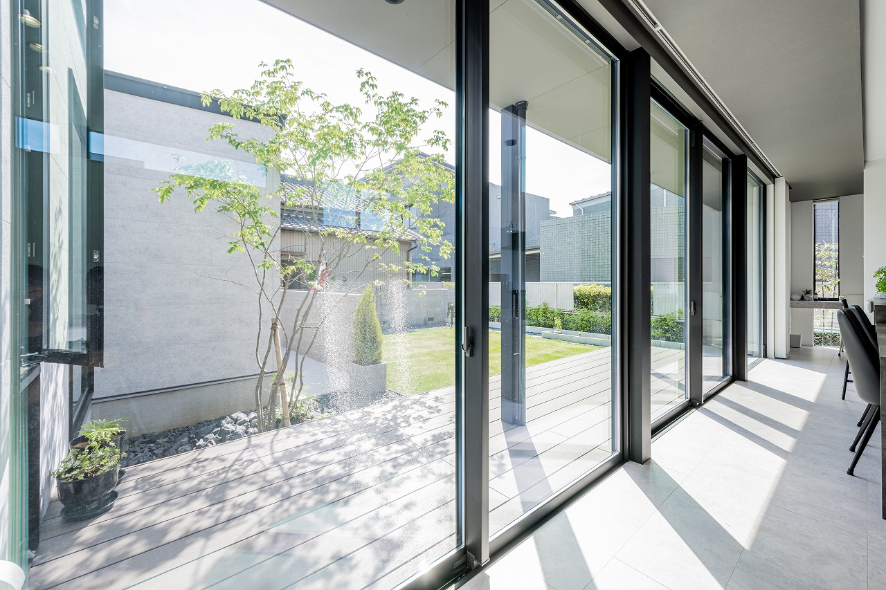 • LDKの中庭側は全面窓ガラス。開放的で、お庭で過ごすご家族の様子も見守れます。