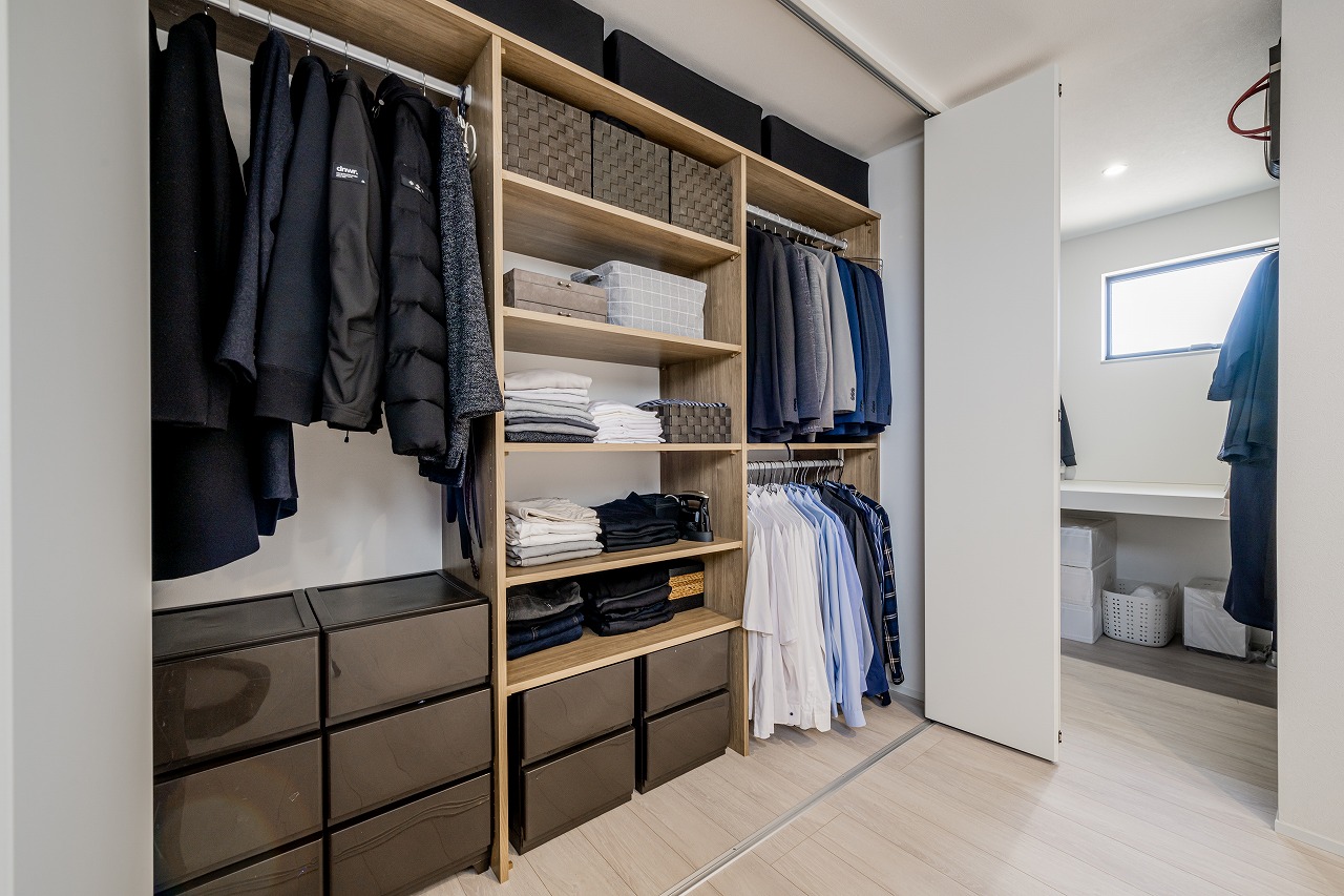 • 南海プライウッドの収納を取り入れ、使い手に合わせた収納スペース。スーツやワイシャツ、小物類もすっきり片づけられます。