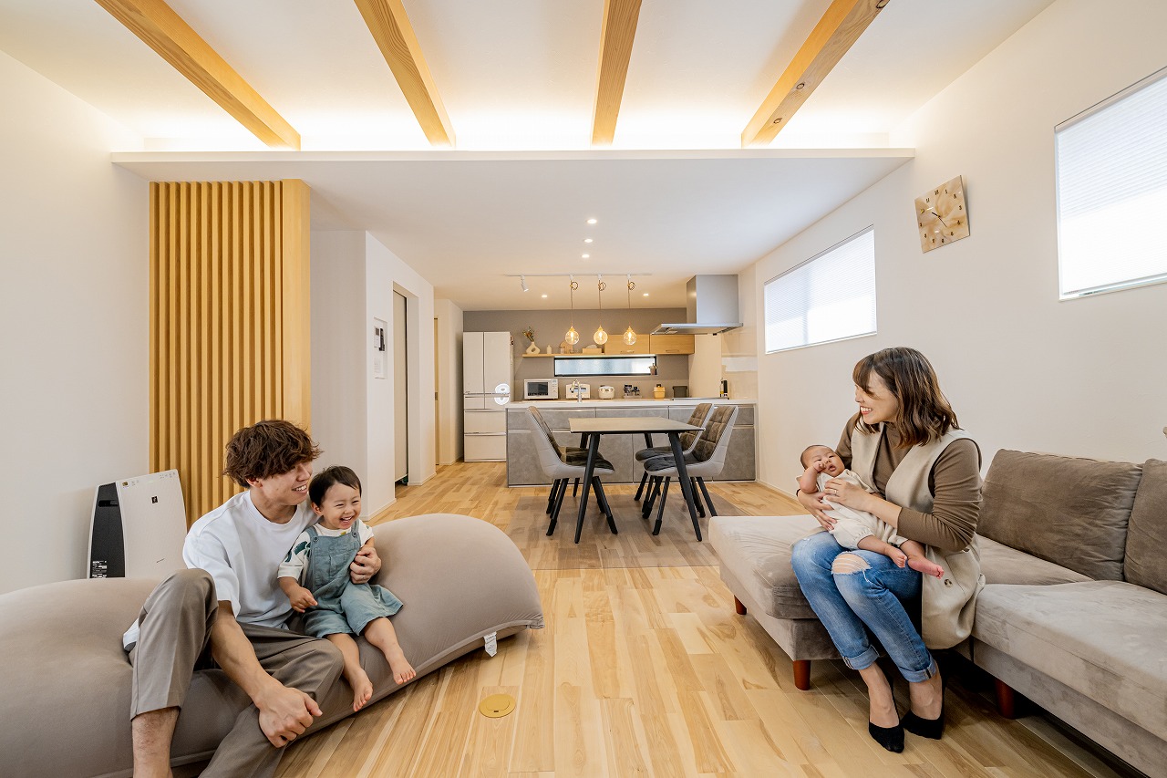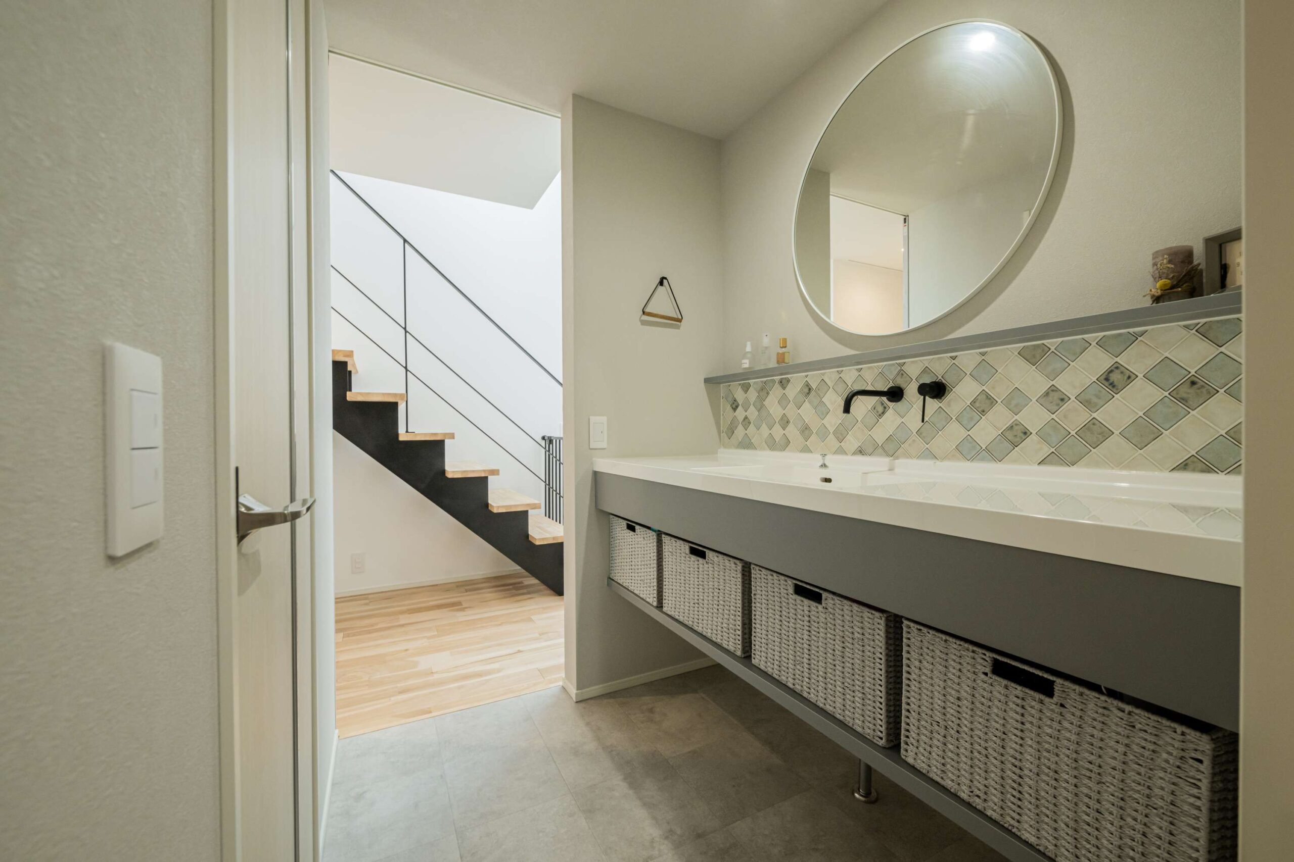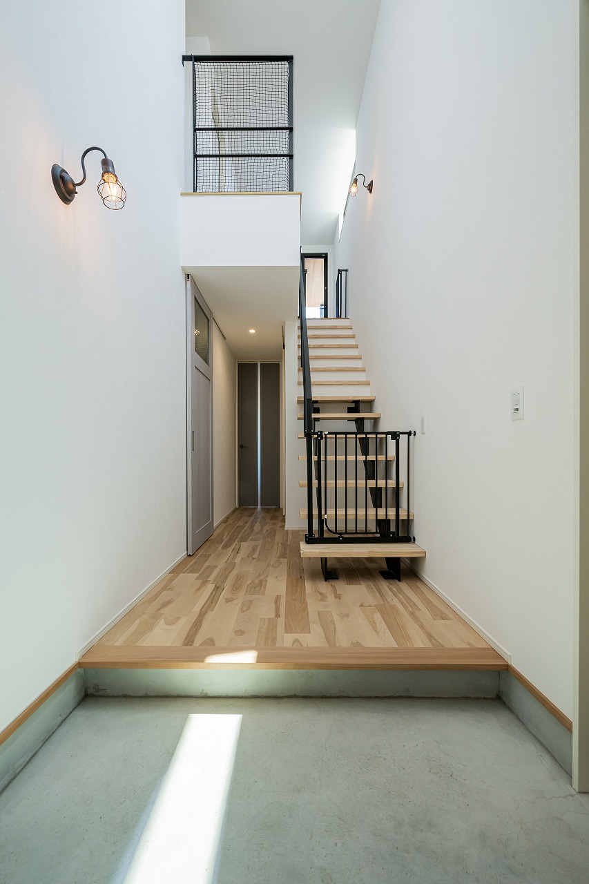 内観は吹き抜けや鉄骨階段、折り上げ天井などで空間にメリハリをつけ、動線もスムーズに計画しました。