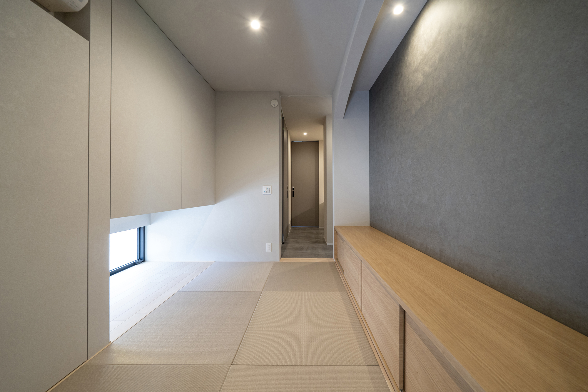 吹き抜けや中庭の窓から差し込む光が、無機質な素材感にやわらかさを添え、上質で穏やかな時間を演出します。