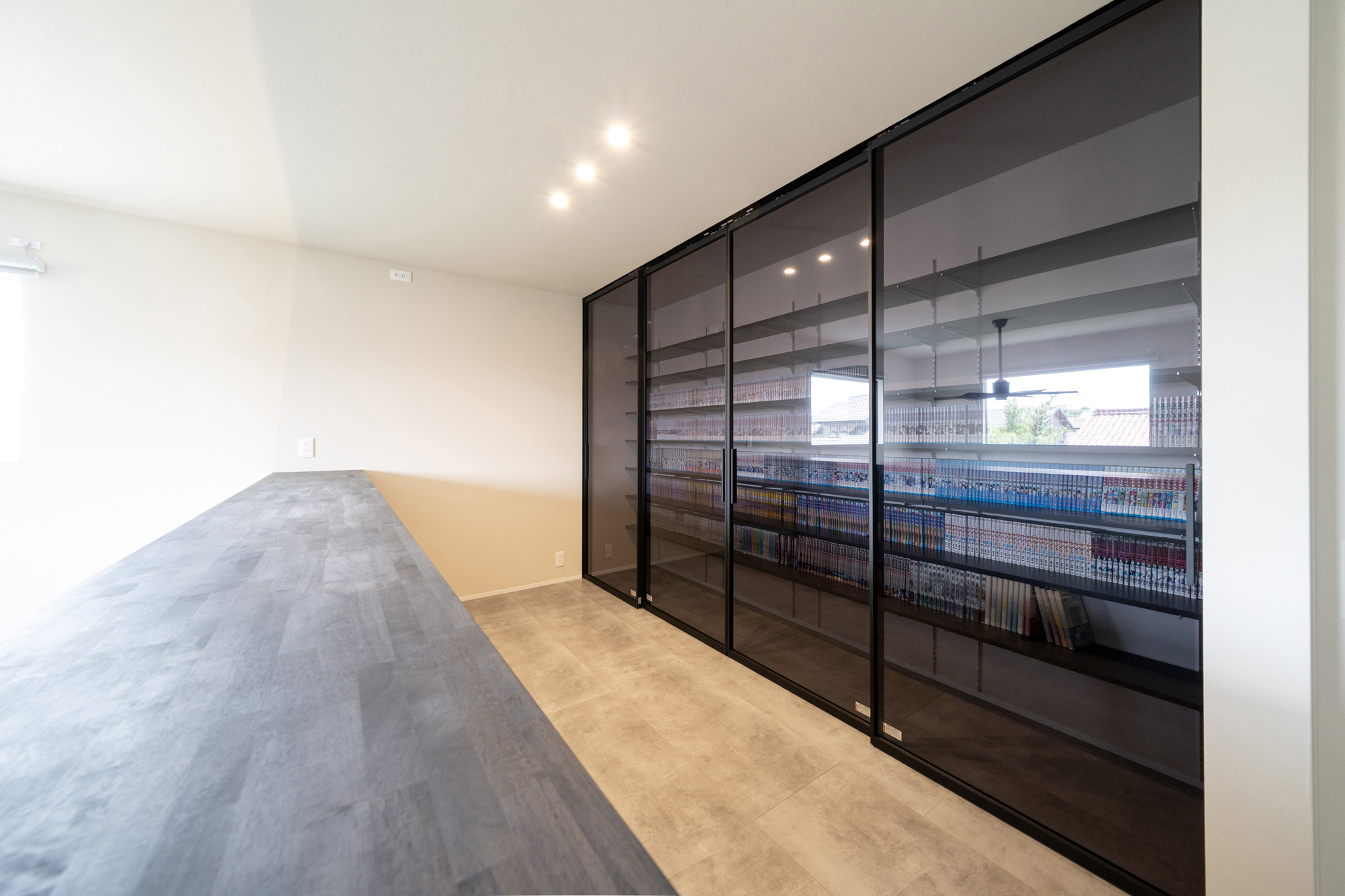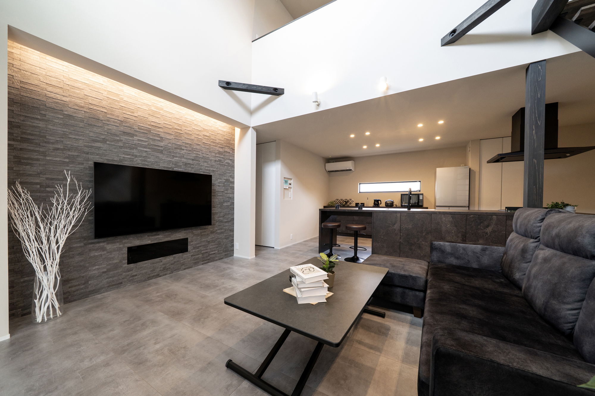 - 吹き抜けには電動ロールスクリーンを採用し、快適に光をコントロール